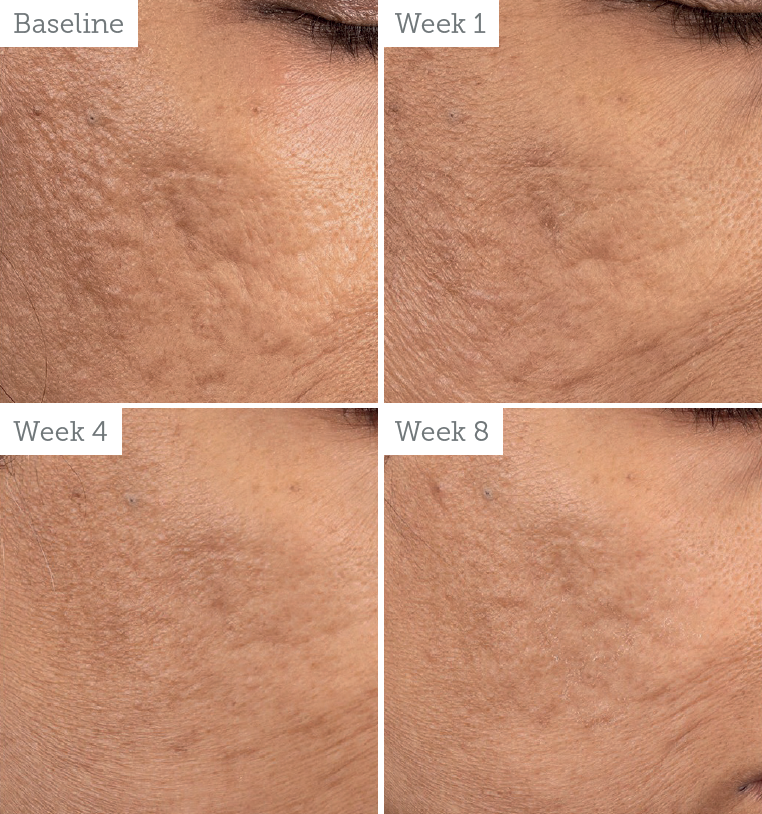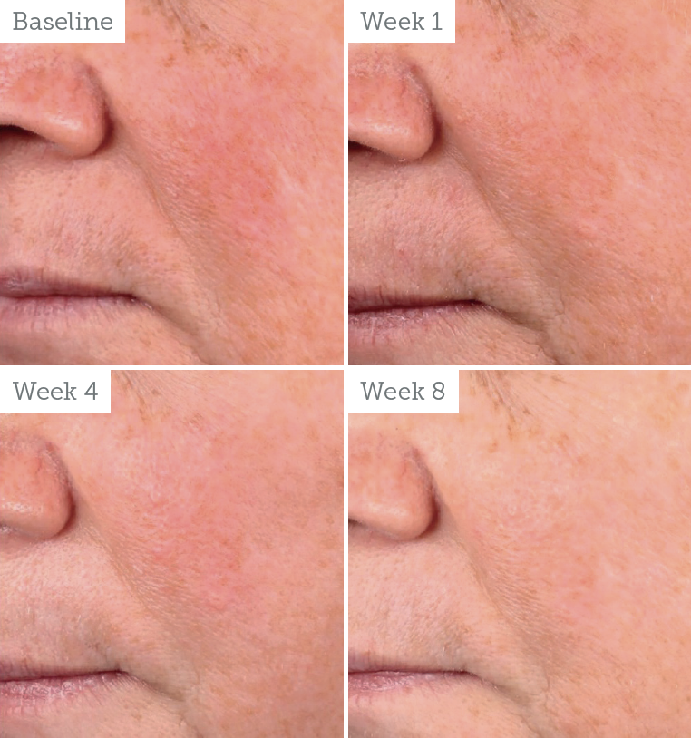 on a female patient, 57 years of age, Fitzpatrick skin type I.1 (Left to right) Results shown at baseline, week 1, week 4 and week 8. Results may vary.